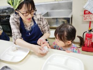 初めての子もお母さんとおしゃべりしながら、ニコニコ笑顔でキッチンを楽しんでくれました。