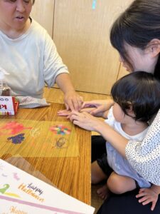 そのあとは、大きな紙に、みんなで海の中をイメージしながら大胆にお絵かきして、作ったカラフルなおさかなさんたちを泳がせて…