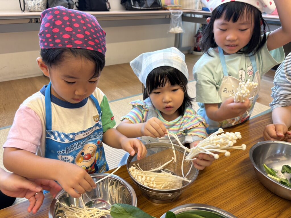 夏休みなので、少し大きくなったお兄ちゃんお姉ちゃんも来てくれて、一緒に小松菜やえのきをちぎったり、玉ねぎの皮むきをしました。