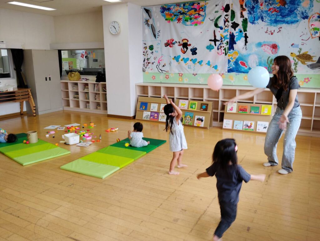 最初は恥ずかしくて行きたくないと言っていたお姉ちゃんもおままごとで静かに遊びだし、風船を膨らませるとママとキャッキャッと声を出して楽しそうにしていました。