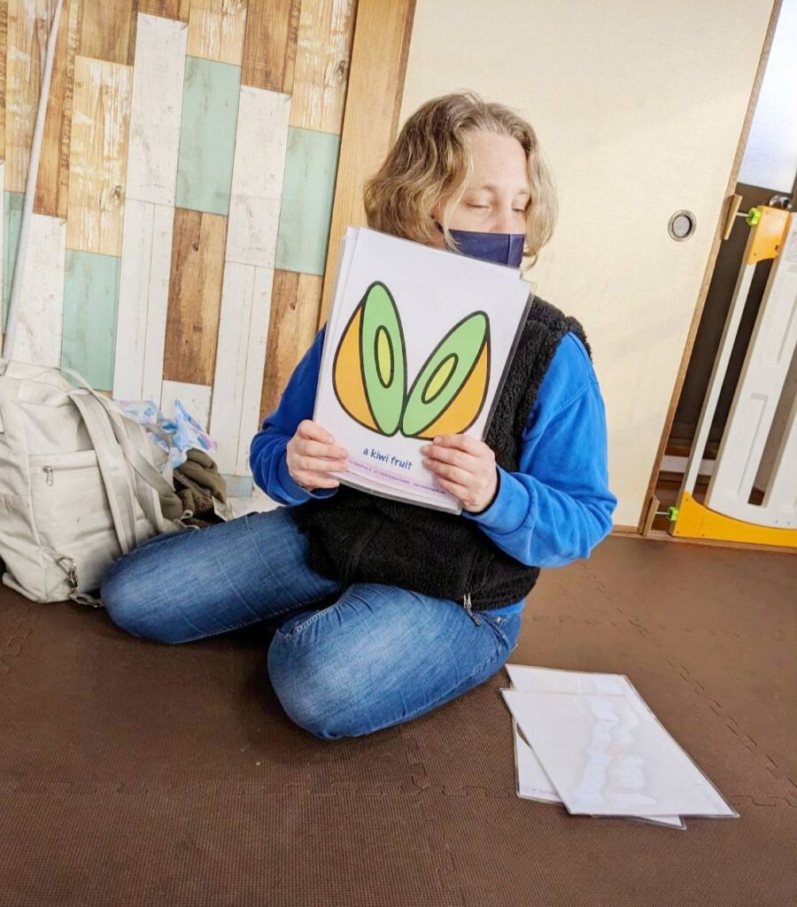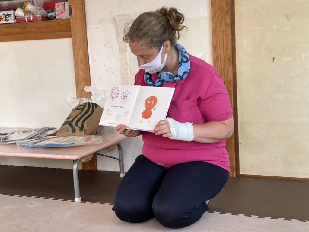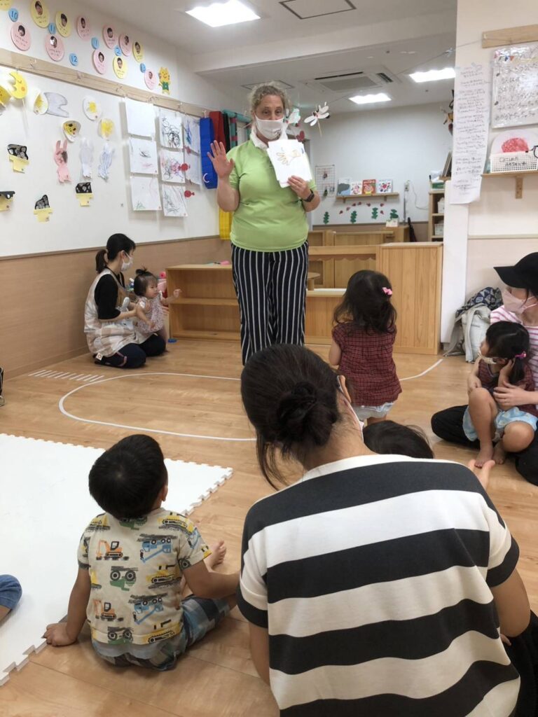 今日は、1組の親子とみん里土曜の一時保育の子と学童たちで遊びました。 始まりのダンスを楽しく踊った後は、キャサリンが絵本…