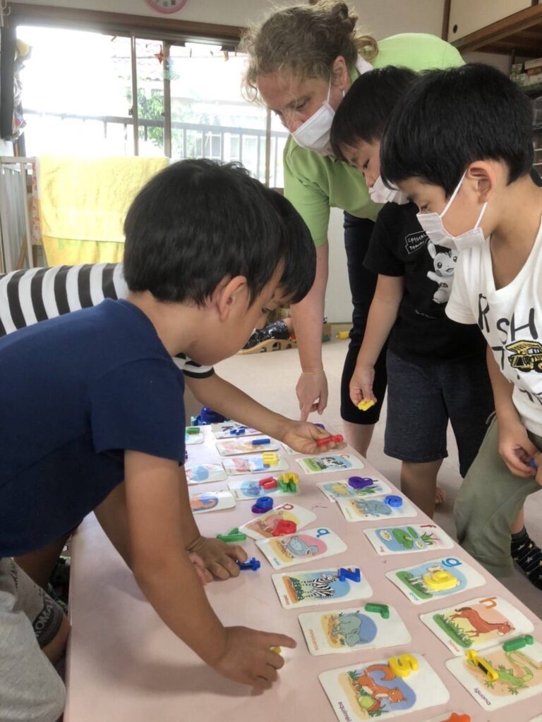 英語の絵本では、アルファベットに隠れている物をみつけると「elephant」と英語で答えたり、みんな積極的に発言していま…