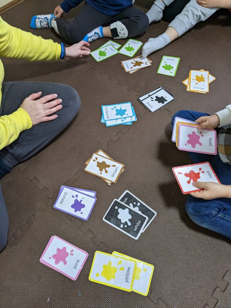 今回は英語に触れながらカードゲームを楽しみました。まずは英語のカードを使ってのばば抜き。同じカードが揃うと「やったぁ」と…