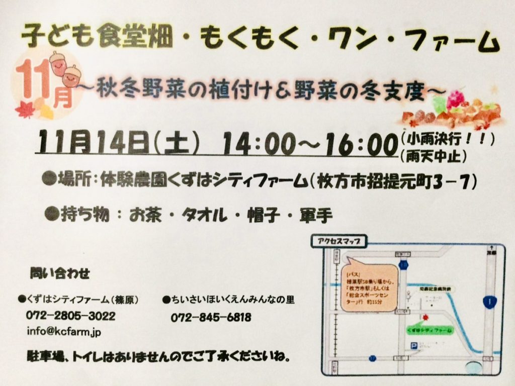 11月のお知らせです。 今回は秋冬野菜の植付けや、 冬支度を予定しています! ●日時:11月14日(土) …