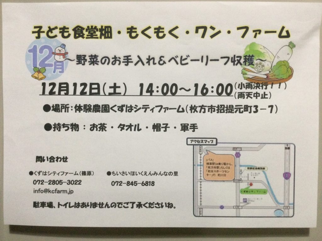12月のお知らせです。 今回はベビーリーフの収穫や 冬の畑のお手入れ予定しています! ●日時:12月12日(土) &nb…