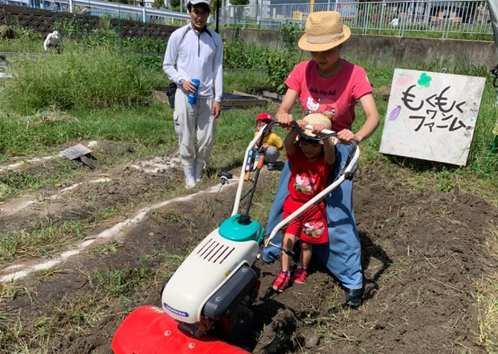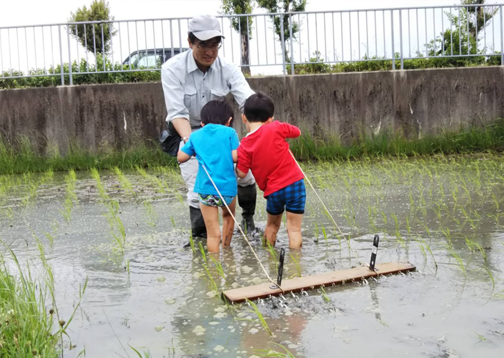シティーファームさん手作りの草取り機で田んぼの草取り体験! 苗を踏まない様に真剣に〜子どもの方が上手に進みます。 ご近所…
