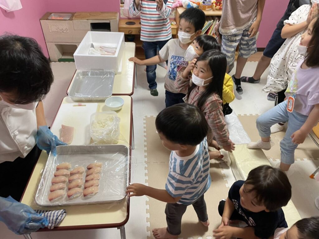 お寿司を持ってきてくれるだけでなく、その場でにぎりの実演をしてそのばでいただきました。今日ははまちのお寿司をにぎっていた…