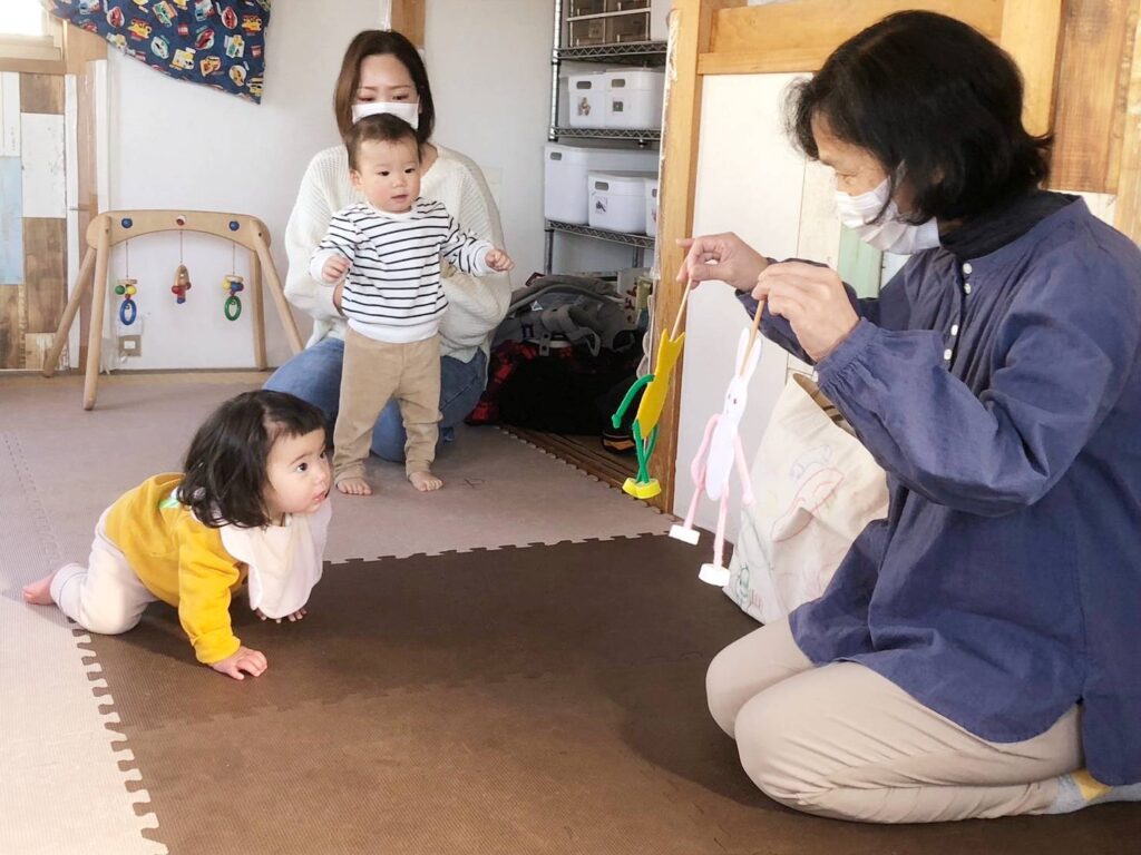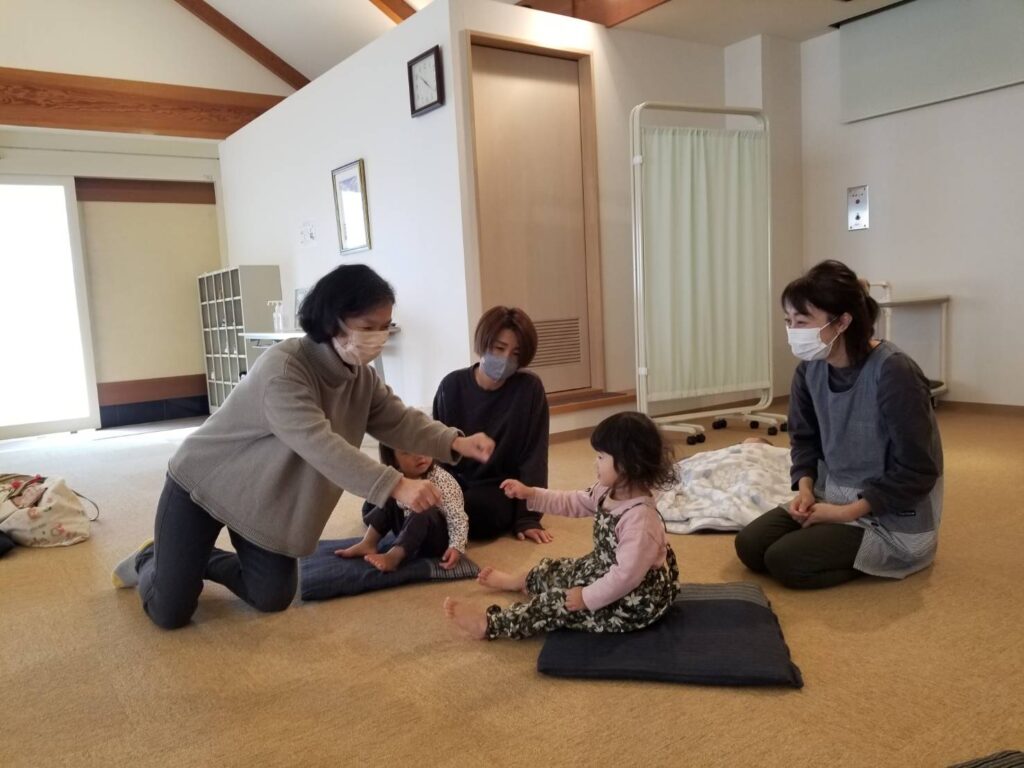 今月はわらべうたの先生と一緒に、わらべうたあそびを楽しみました。目と目をあわせて、お母さんとたくさんふれあう時間…笑い声…