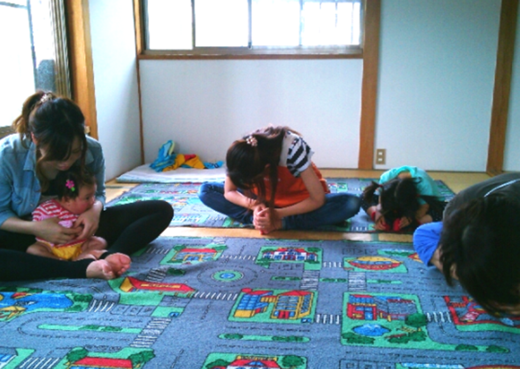 呼吸を整え、体をゆるめると気持ちいいですね。子どもさんも一緒に、ぐーっと体を伸ばして一緒にリラックスタイムです。