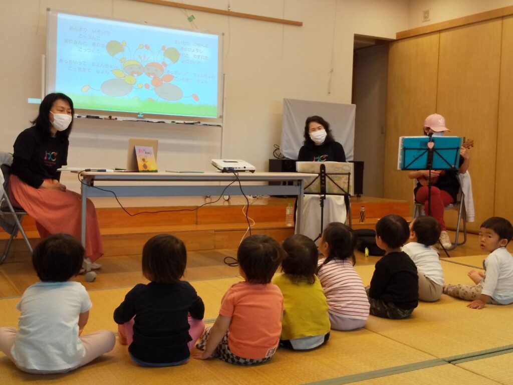 みんなのビィーゴほいくえんから、はなクラス・ひかりクラスのお友達が遊びに来てくれました。 ♫「むすんでひらいて」のお歌に…