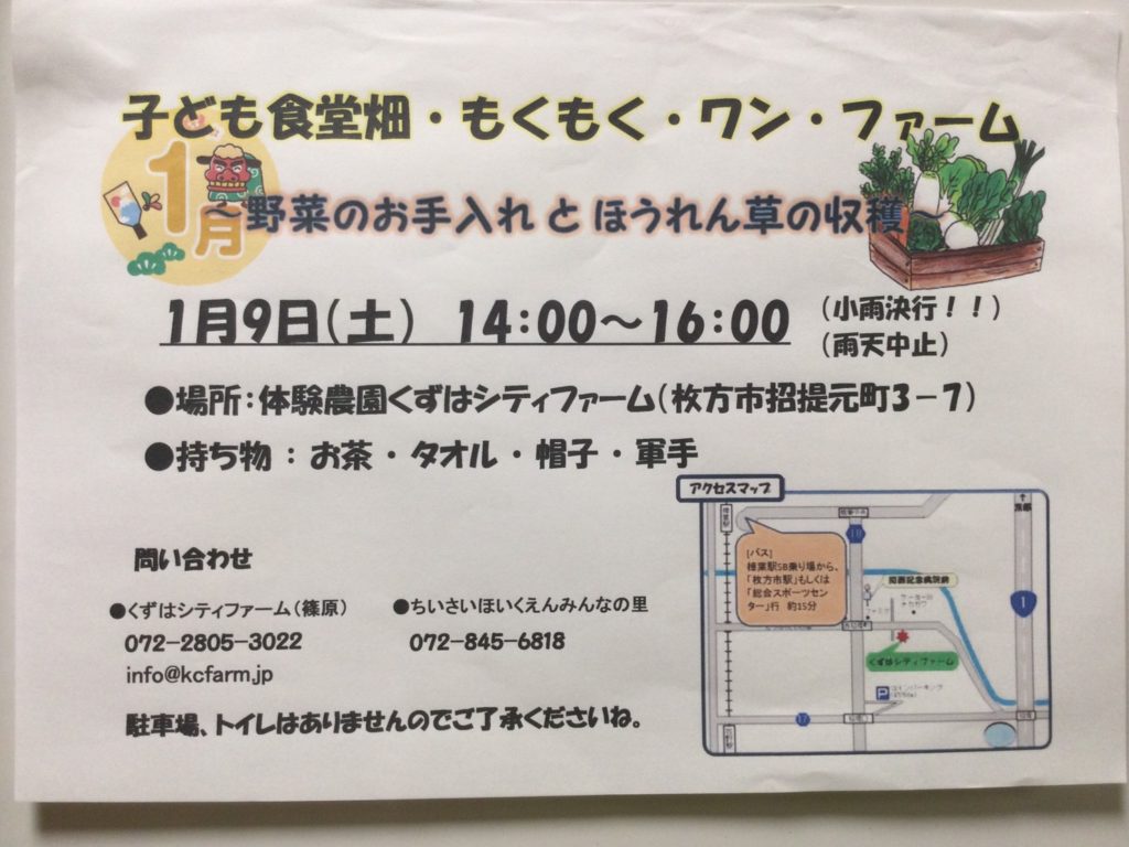 1月のお知らせです。 今回はほうれん草やベビーリーフなどの収穫や 冬の畑のお手入れ予定しています! ●日時:1月9日(土…