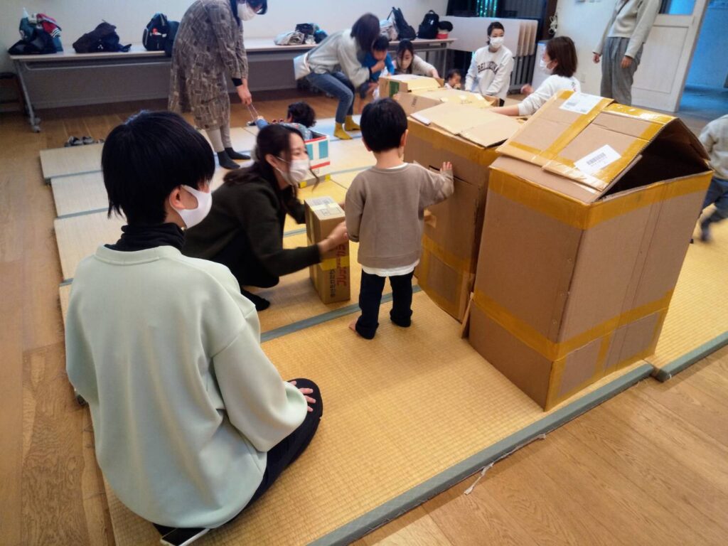 今日は7組の親子が参加してくれました。まずはお子さんの手形をとりその形に沿ってお花や果物の小さなシールを貼っていき世界で…