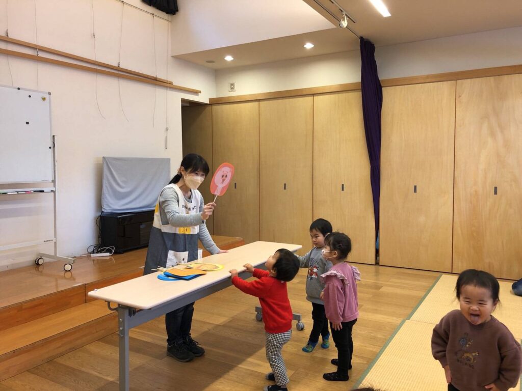12月27日㈪、寒い日でしたが5組の地域の親子さんがあそびにきてくれました😊 「はらぺこあおむし」の大型…