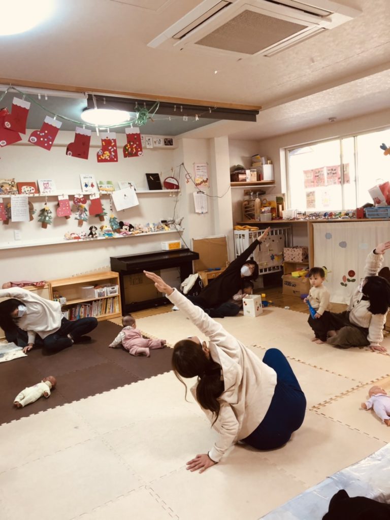 今回のつながりゲスト、高田先生をお呼びして、親子でストレッチを楽しみました。 子どもを膝の上に乗せながら肩を回したり、股…