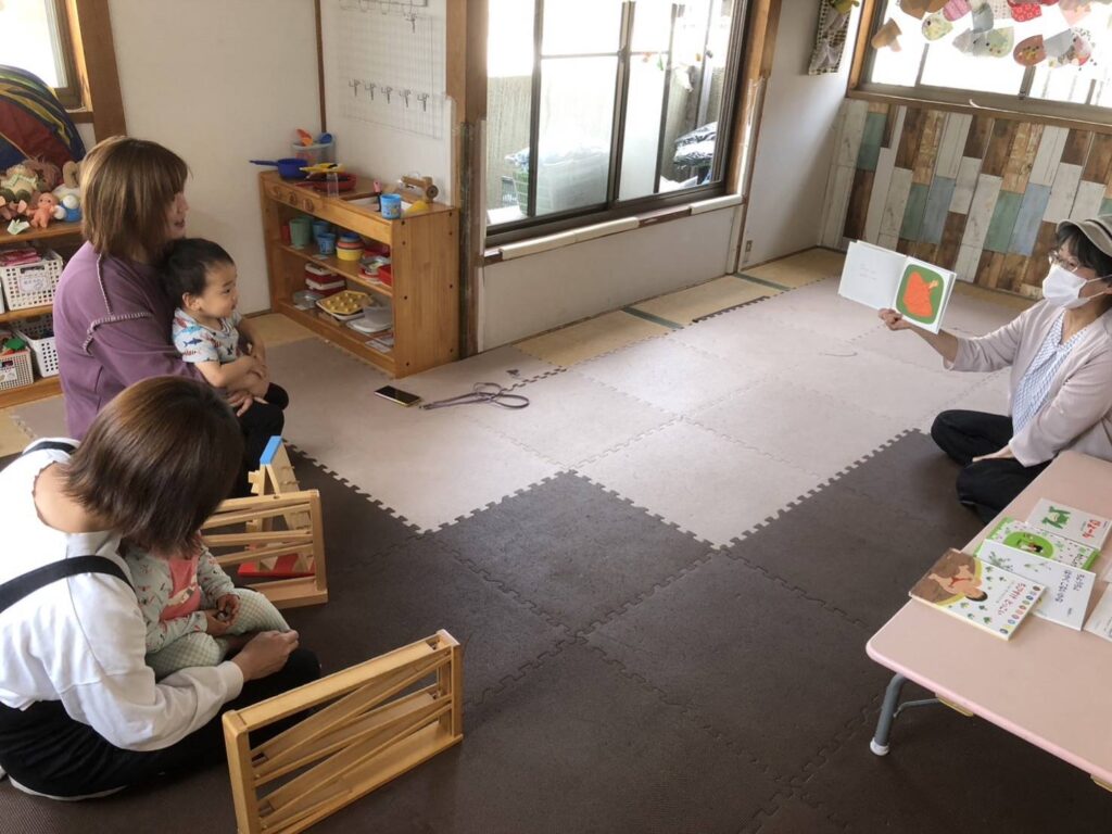今回はひまわり畑の中谷先生が来て下さって、一緒に春の絵本やふれあい遊びを楽しみました。中谷先生の優しい声が、絵本の世界観…