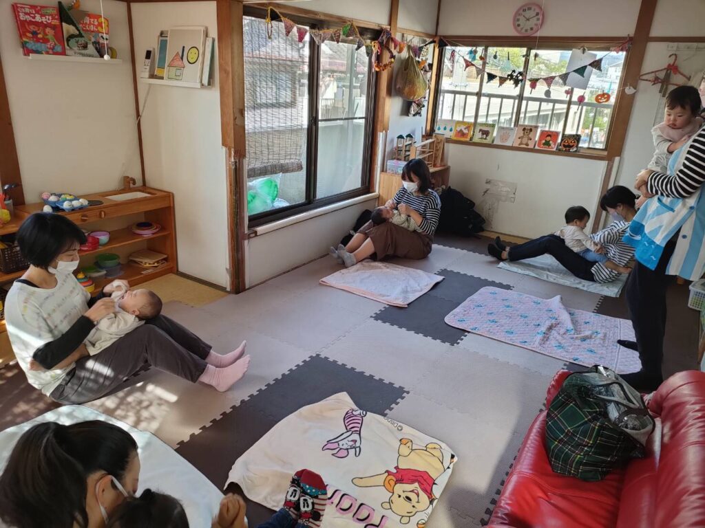 11月12日(金)10か月の赤ちゃんと1歳半のお子さんを連れて、2組の親子が遊びに来てくれました!みん里からも園児さんが…