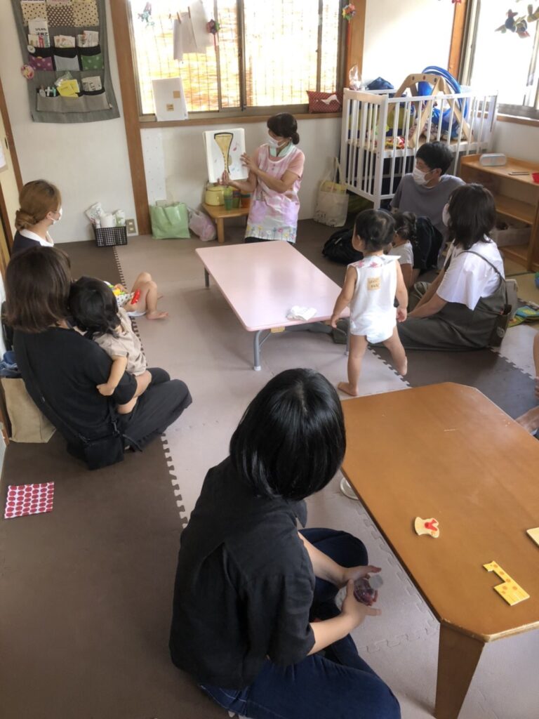 3組の親子が遊びに来てくれましたよ。今回は少人数での里っこちゃん。おへんじはーいの時に、好きな食べ物や遊びも聞いてみたり…