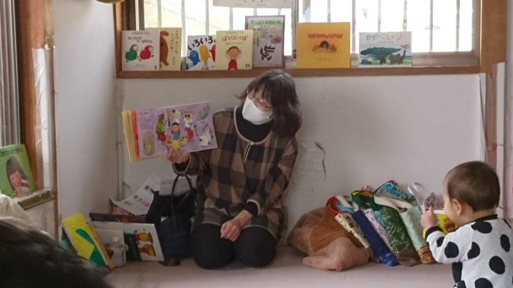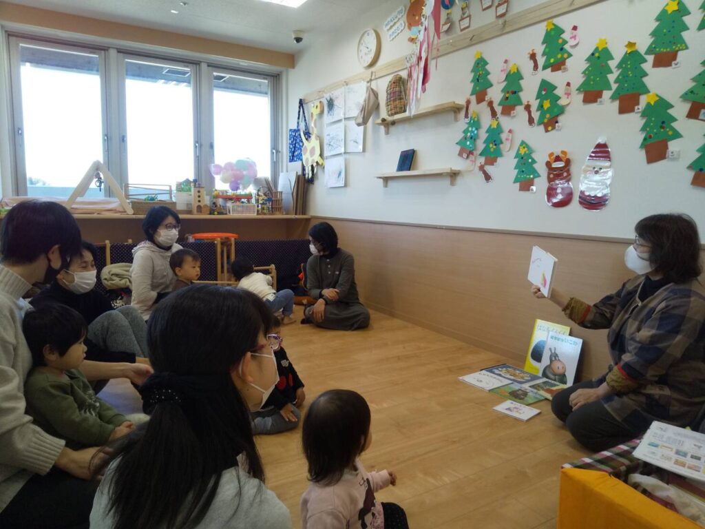 12月14日㈫えほんのひろば3回目が開催されました 絵本の読みきかせに興味を持ってききいるお友だち。「子どもは2冊、集中…