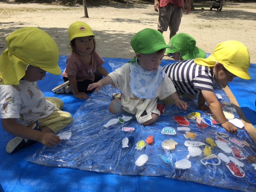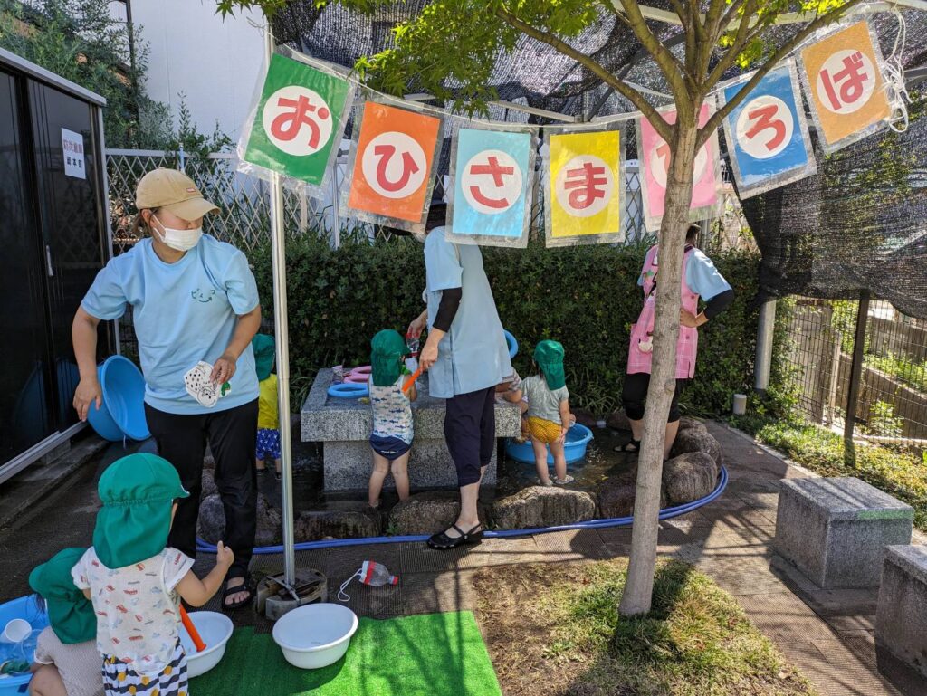 今月のおひさまひろばも水遊びを存分に楽しみました。ビィーゴほいくえんは、岡本町の地域のみなさんが大切にしておられる下井戸…