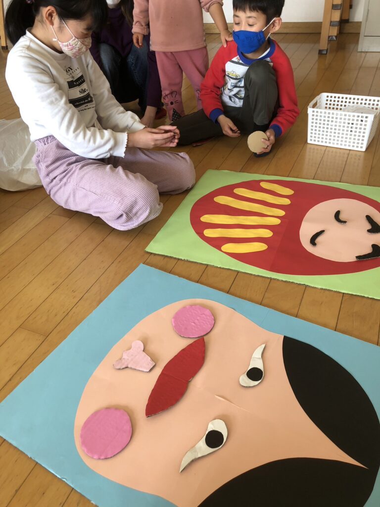 節分を前にして、鬼やお福さんのお話を読んだあと、豆を入れるますを作ったり、新聞紙をビリビリしながら豆まきの代わりを作って…