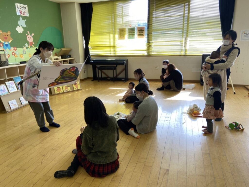 1月15日㈯のどんどこは、5組の地域の親子があそびに来てくれました はらぺこあおむしの歌に合わせて大型絵本を見ると、ニコ…
